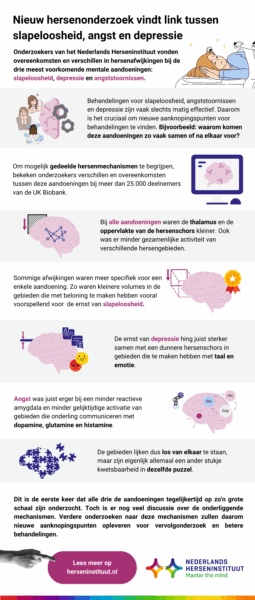 ‘Daarnaast zijn er ook afwijkingen te vinden die specifiek zijn voor elke aandoening. Zo blijkt de ernst van slapeloosheid meer samen te hangen met kleinere volumes in de gebieden die met beloning te maken hebben. De ernst van depressie hangt juist sterker samen met een dunnere hersenschors in gebieden die te maken hebben met taal en emotie. Angst is juist erger bij een zwakkere amygdala-reactiviteit en functionele connectiviteit tussen gebieden waar dopamine, glutamine en histamine belangrijk zijn voor de onderlinge communicatie.’